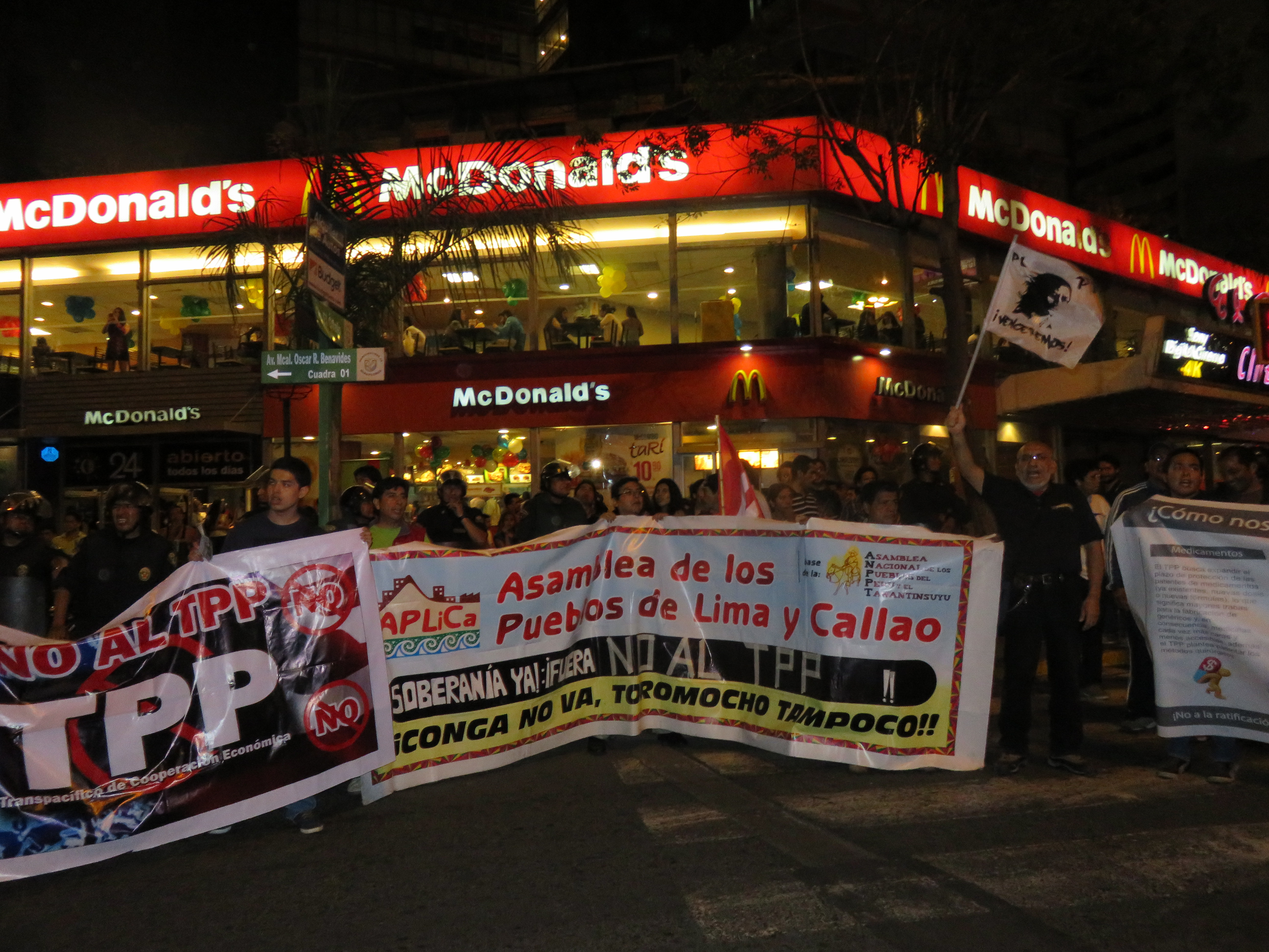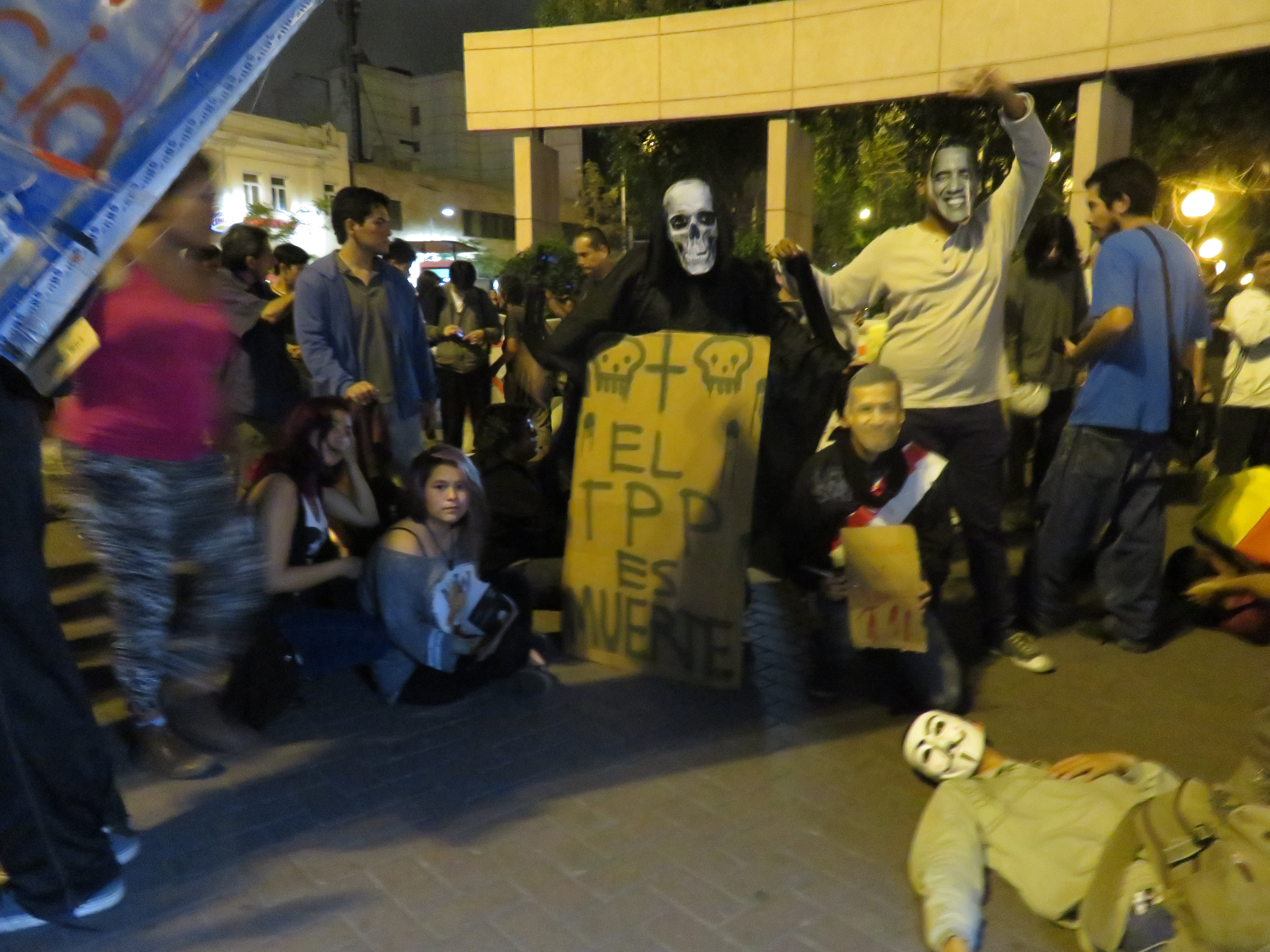Lima, Perú .- Bajo el lema «TPP, tratado de la muerte», decenas de jóvenes y activistas, recorrieron diversas avenidas de Lima, para pedir al gobierno no firme el Acuerdo Comercial Transpacífico, entre los Estados Unidos y 11 países, donde se encuentra el Perú, que deberá ser suscrito este 4 de febrero en Nueva Zelanda.