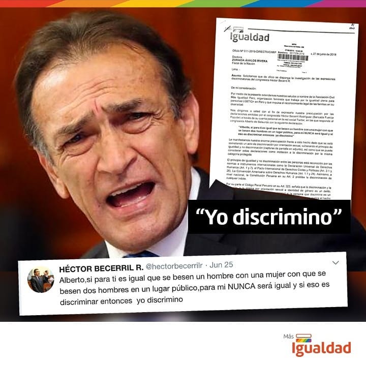 La denuncia que fue presentada el 3 de julio a la presidenta de la Comisión de Ética, Janet Sánchez (Peruanos por el Kambio), recuerda que Héctor Becerril a través de su comentarios ha cometido el delito de “discriminación e incitación a la discriminación” contra la comunidad LGTBI.