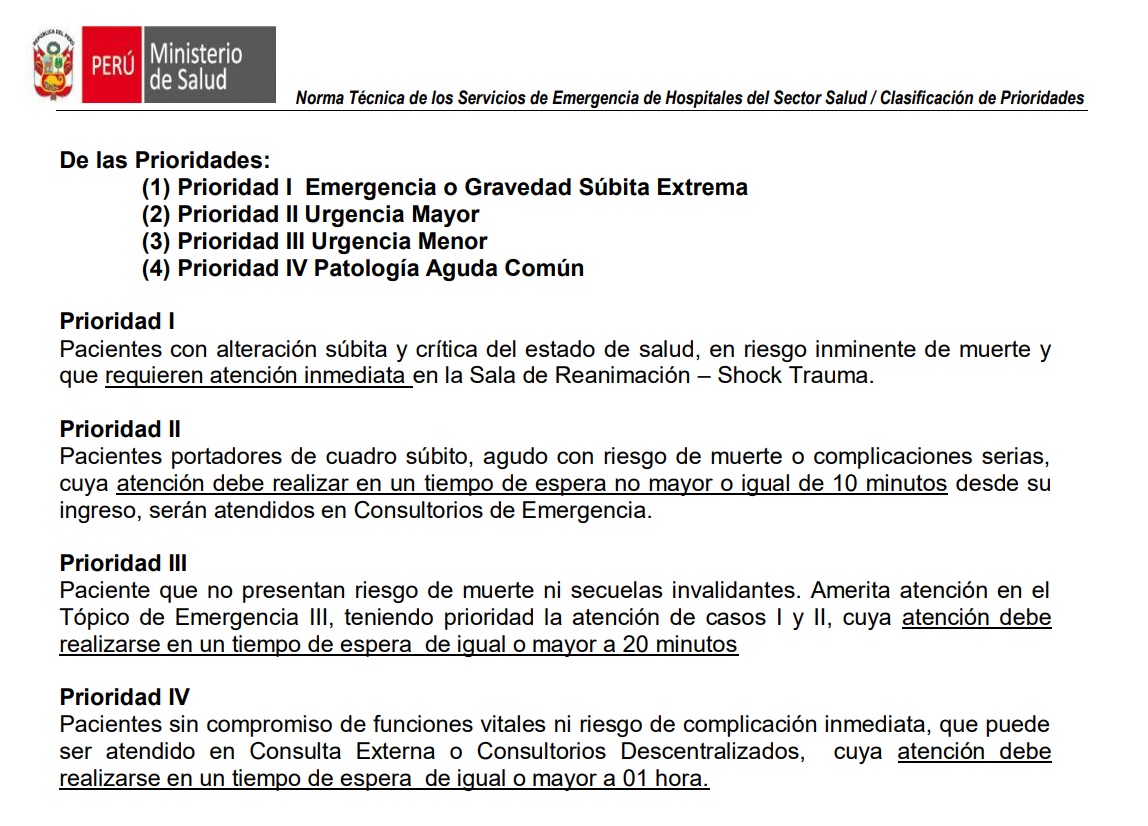 En efecto, la norma establece hasta cuatro niveles de prioridad en la que se indica que se debe atender de inmediato o dependiendo de la patología  el paciente o usuario debe esperar más de una hora para ser atendido. El también director de la ONG Justicia y Salud, señaló su disconformidad con la existencia de cajas de pago al interior de los hospitales o centros de salud, ya que según la Ley de Aseguramiento Universal en Salud, todos los peruanos deberíamos tener un seguro sanitario que financie las atenciones, por lo que las cajas no tendrían razón de existir en los sanatorios.