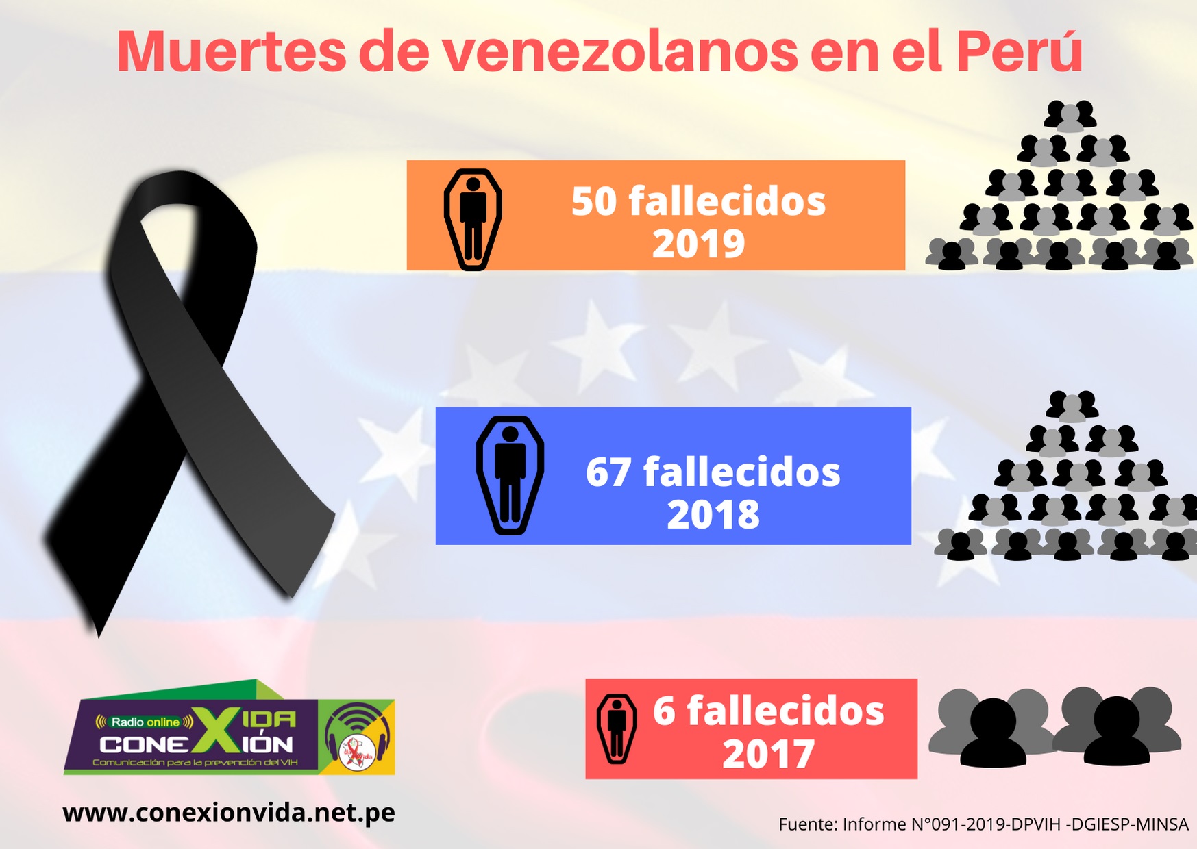 De acuerdo al Informe Nº 091-2019-DPVIH-DGIESP/MINSA, de la dirección de intervenciones estratégicas en salud pública del MINSA, en el año 2017 se reportaron la muerte de 6 migrantes venezolanos; al año siguiente, la cifra se incrementó a 67 decesos; y, con respecto al 2019, se registraron 50 casos hasta el 16 de setiembre último. Se suma un total de 123 muertes y entre ellas, hay varias personas con VIH.