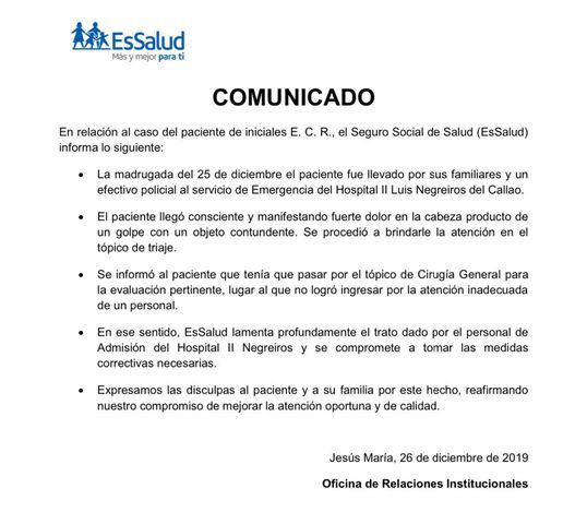 EsSalud se pronunció a través de un comunicado donde detallan que el joven llegó al hospital Negreiros del Callao consciente y que lo atendieron por Triaje, pero que no pudo pasar por Cirugía por la atención ‘inadecuada’ de un personal. Asimismo, lamentan la actitud del empleado captado por la madre del paciente y se comprometen a tomar las medidas correctivas.