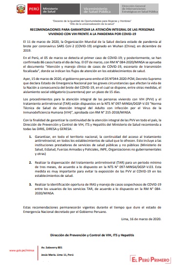 Lima, Perú.- Personas con VIH en varias regiones del país denuncian que, en medio de la emergencia sanitaria por COVID-19, los hospitales del MINSA y EsSalud no acatan la entrega de medicamentos para tres meses de terapia antirretroviral, tal como recomendó esta semana el Ministerio de Salud con el fin de garantizar la atención integral de los usuarios con VIH, frente a esta crisis.