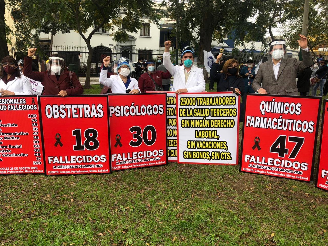 La manifestación fue en el frontis del Ministerio de Salud y los profesionales del sector mostrarán banderolas con las cifras de profesionales de la salud fallecidos por Covid hasta la fecha y con ello exigirán se cumpla con los acuerdos firmados, entre los cuales está la de brindar equipos de protección personal para todos los trabajadores de salud y el pase de profesionales contrados bajo la modalidad de terceros a CAS.
